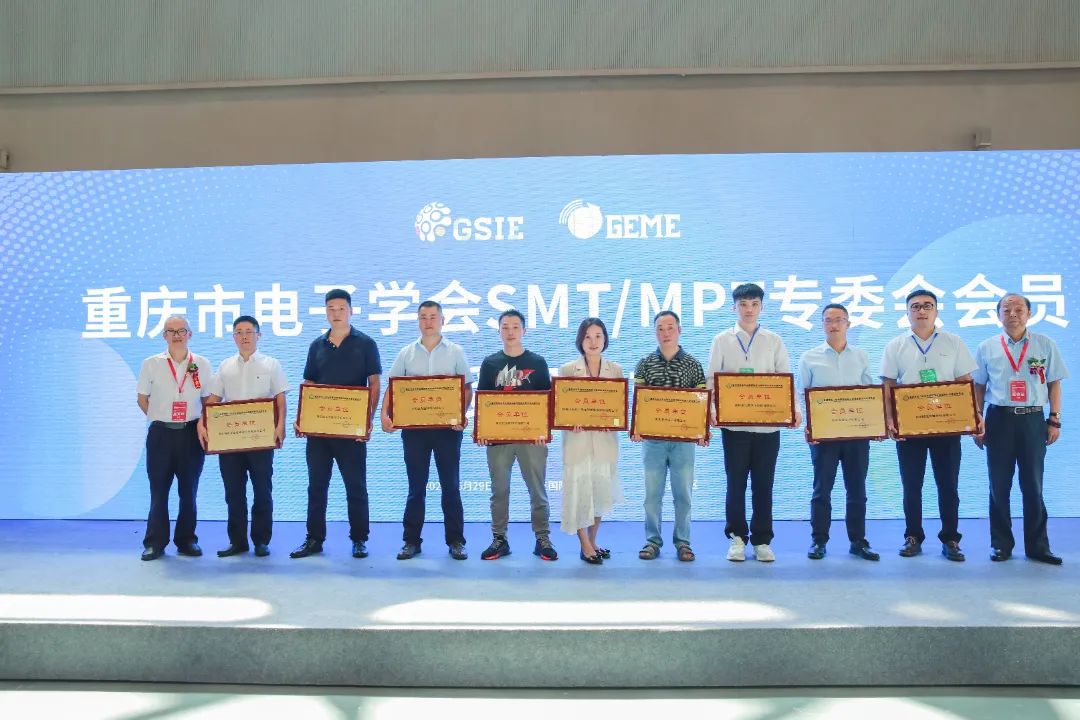 本屆博覽會同期舉辦了“GEME 2022電子產業鏈創新發展大會”,匯聚智造精英,共同為電子產業熱點話題展開交流。會上,重慶市電子學會表面貼裝與微組裝技術委員會為深圳市海目星激光智能裝備股份有限公司授會員單位牌匾